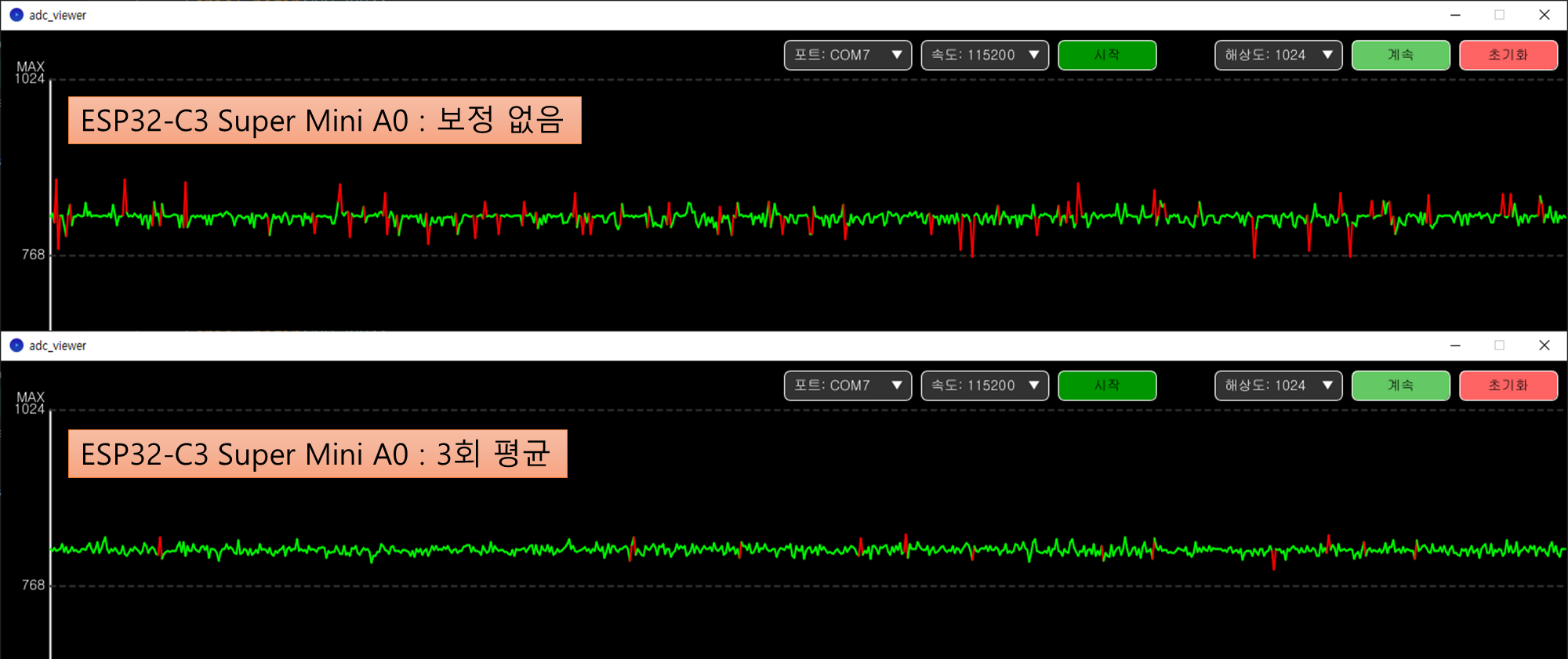 - 문제: 측정값에 상당한 노이즈가 많아 값이 크게 변동하고 불안정합니다. 심지어 입력 전압이 안정적일 때도 일관성이 떨어집니다.